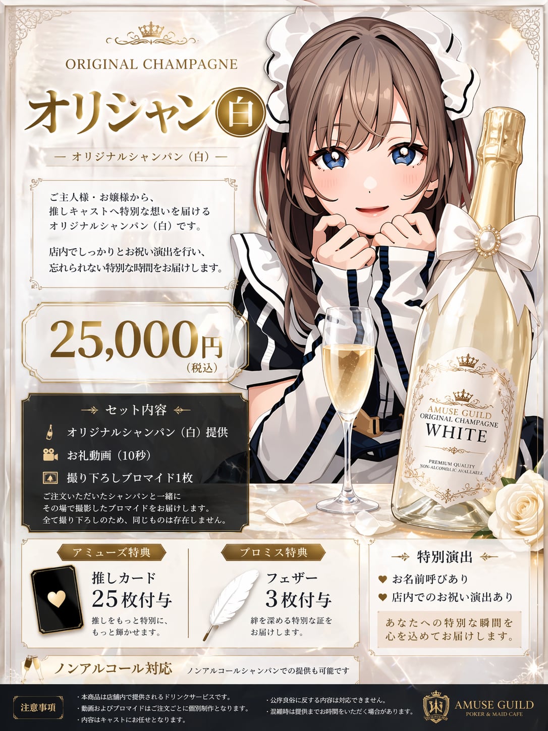 ご主人様・お嬢様から、推しキャストへオリジナルシャンパン(白)をプレゼントできます。